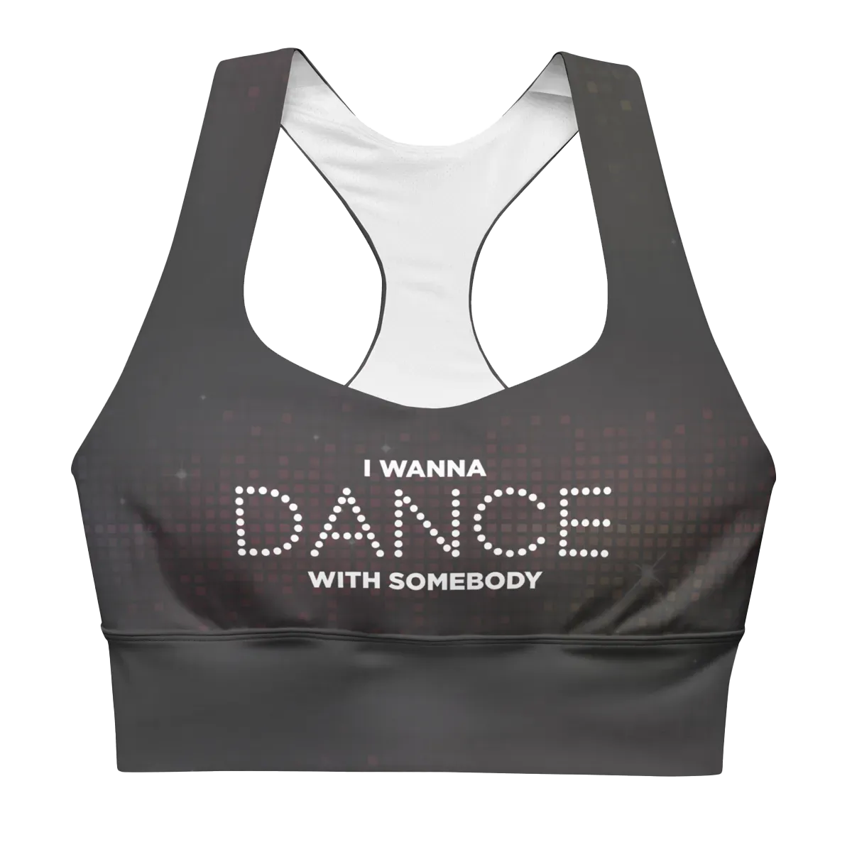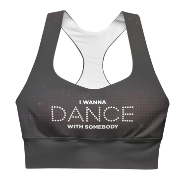Introducing the Whitney Houston "I Wanna Dance with Somebody" Sports Bra in Grey Sparkle, a dazzling and supportive garment that channels the spirit of Whitney's iconic hit.